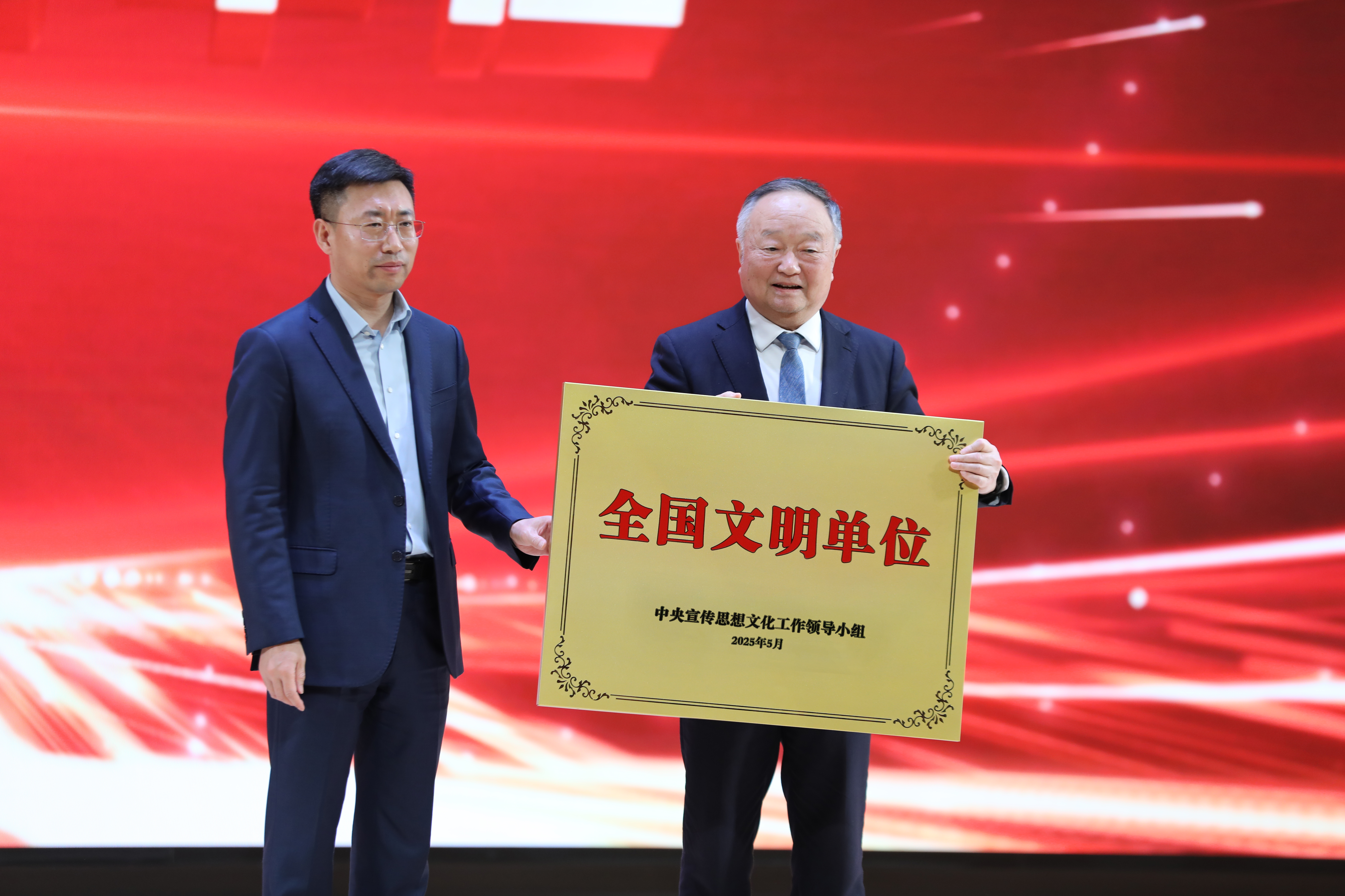 武光锋为五征集团颁发“全国文明单位”奖牌。